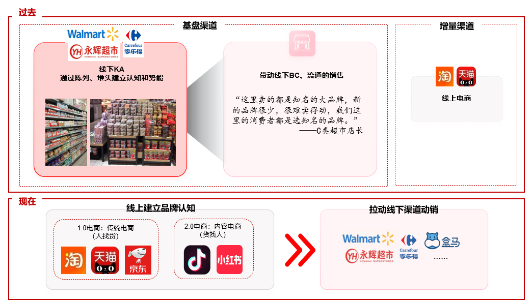 对于食饮企业而言,线上线下渠道缺一不可。当前国内的渠道模式正在更迭,由原来的“KA建品带流通,线上淘系成增量”变成“抖书建品提心智,线下渠道扩销量”,渠道的变化也孕育了一批线下渠道基础弱、但线上运营灵活的“抖品牌”,在线上建心智方面远超那些起于传统线下渠道的企业。